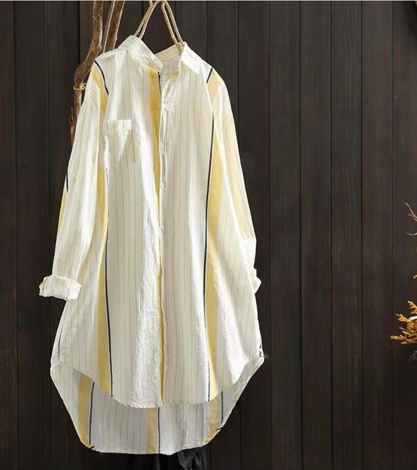 > 新品*シャツ チュニック コットン プリント柄 ゆる レディース ロングシャツ 薄い 長袖 ブラウス オフィス カジュアル風*イェロー