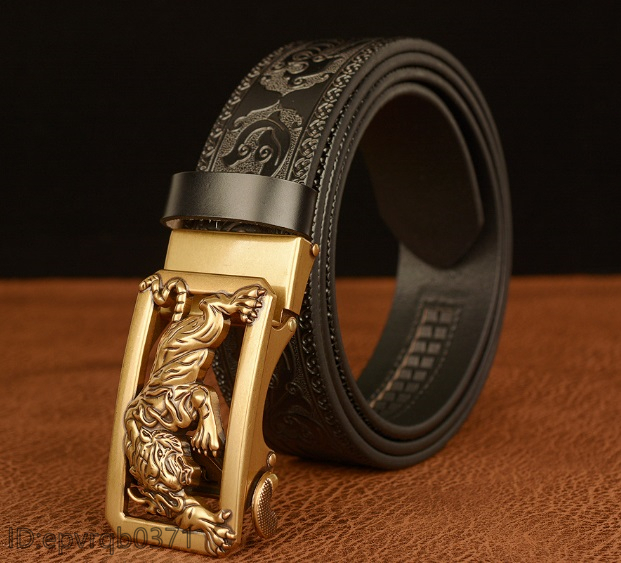 - レザーベルト 新品 オートロック式 バックル トラ 本革 メンズ ベル ト 幅3.5センチ 柄物 紳士 長さ調整可能 2色選ぶ/黒