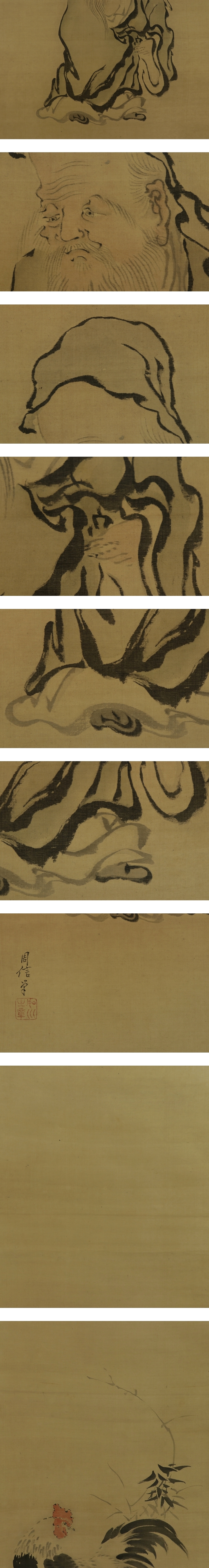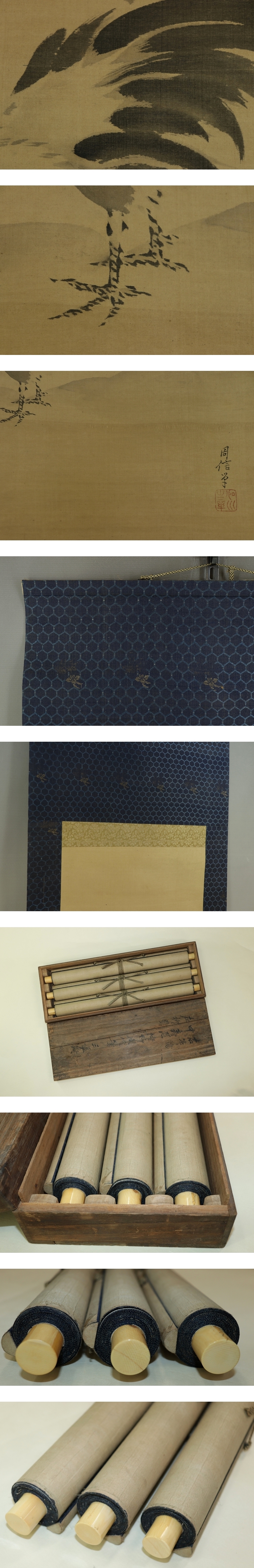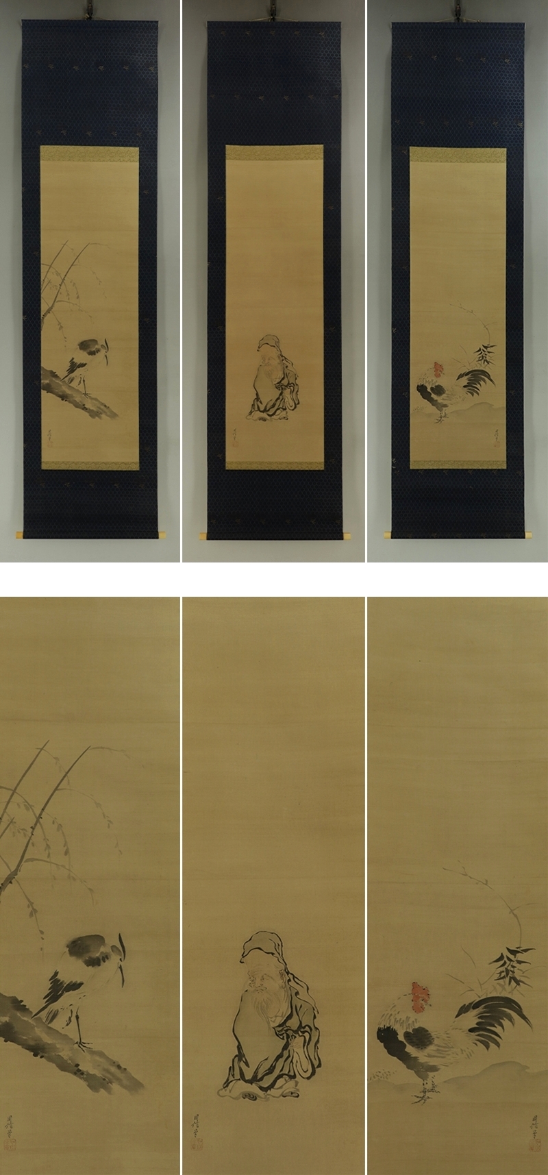 - 【模写】狩野周信【三対幅・慶祝図】◆絹本◆合箱◆掛軸 t10043
