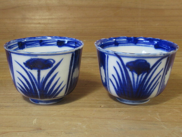 - ◆蕎麦猪口:7:◆『あやめ』輪花縁◆染付:青華◆明治:コバルト◆2客◆