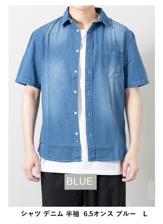 - 送料無料 シャツ デニム 半袖 ウォッシュ加工 6.5オンス ブルー L 新品