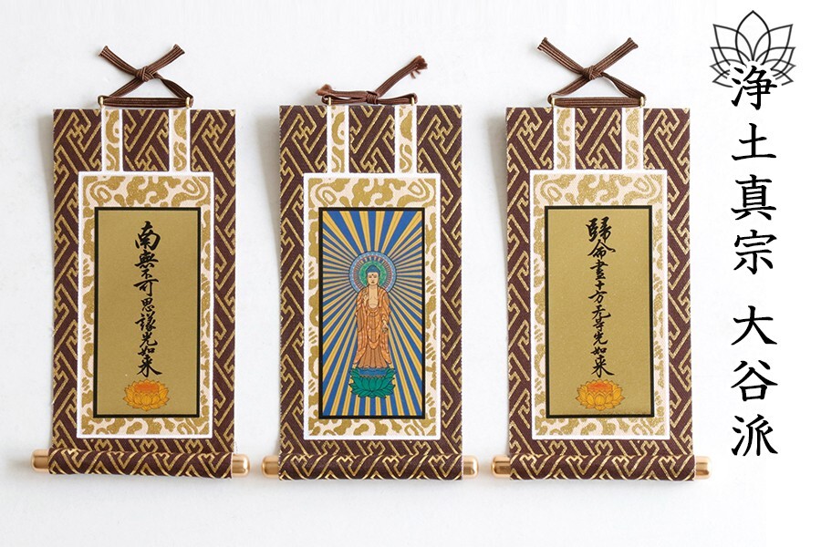 - 仏具 掛軸 茶 金 ■ 浄土真宗 大谷派(東) ■ 50代 三点セット 阿弥陀如来立像 十字名号 九字名号 鋲・フック付 掛け軸 高さ28cm