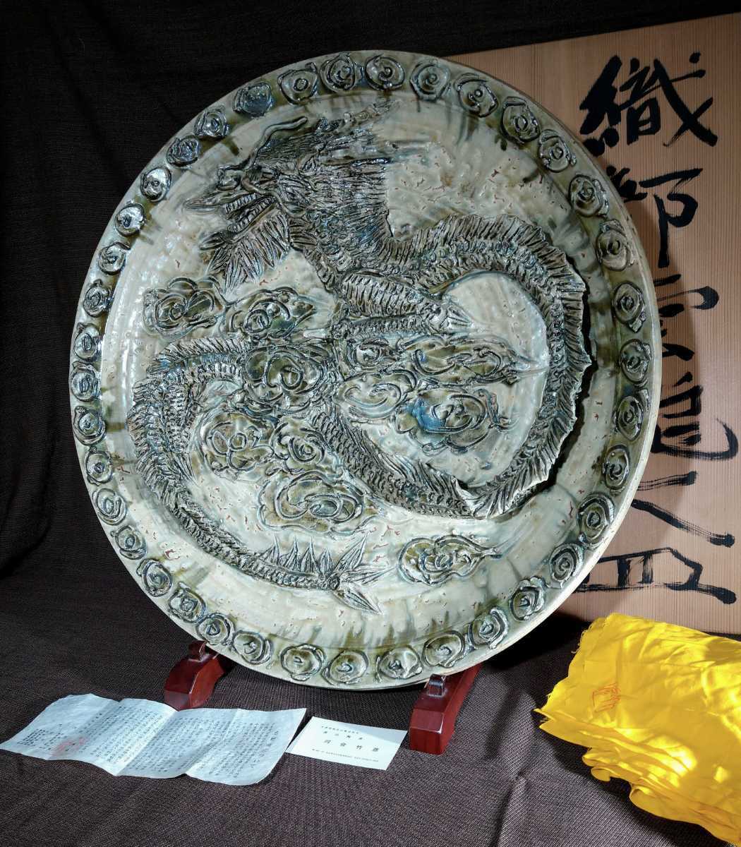 - 河合竹彦 「織部雲龍大皿」 大作 浮き彫り 雲龍図 58cm 大飾皿 共箱 共布 清山窯 志野焼 河合清 a-大08d489