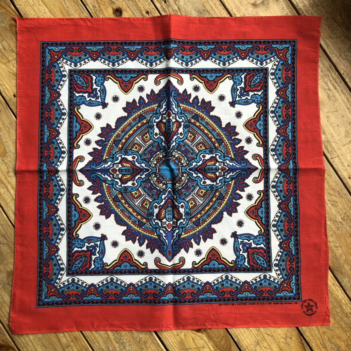 - 送料無料 Vintage フラクタル バンダナ Made in USA 万華鏡 レッド サイケデリック 総柄 アメリカ仕入れ 雑貨 ヴィンテージ A0979