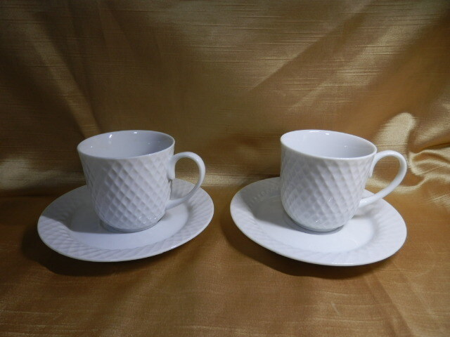 - ホワイト カップ&ソーサー 網目レリーフ 2客 高6.5x7cm 皿13.5cm
