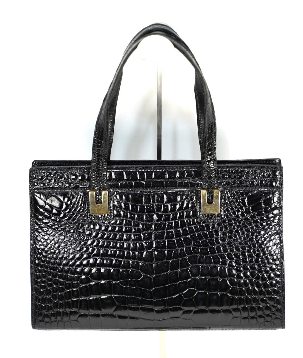 - フランス製 ビンテージ 鞄 サイド引き開閉 金具 クロコダイル ハンドバッグ バッグ 黒