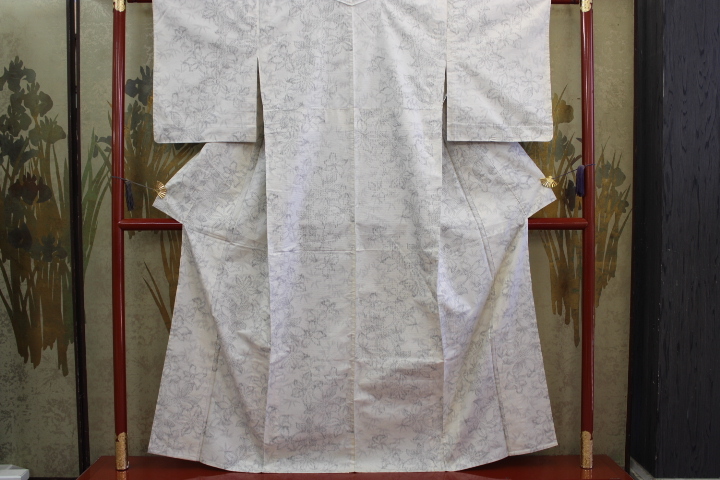 > きもの今昔6994 単衣のきもの 広衿セブセ付き単衣手縫い仕立て 正絹白地絣グレー色の花柄 身丈152cm