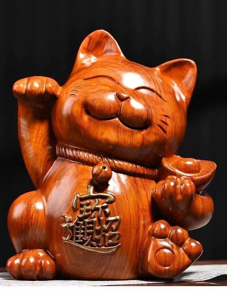 - 花梨木彫 招き猫 玄関 客間の置物 招財 職人手作り 木彫り インテリア 開運 仏像