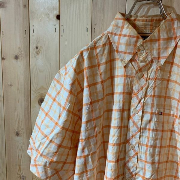 > [KWT1979] TOMMYHILFIGER 半袖ボタンダウンシャツ メンズ オレンジチェック柄 M ポス