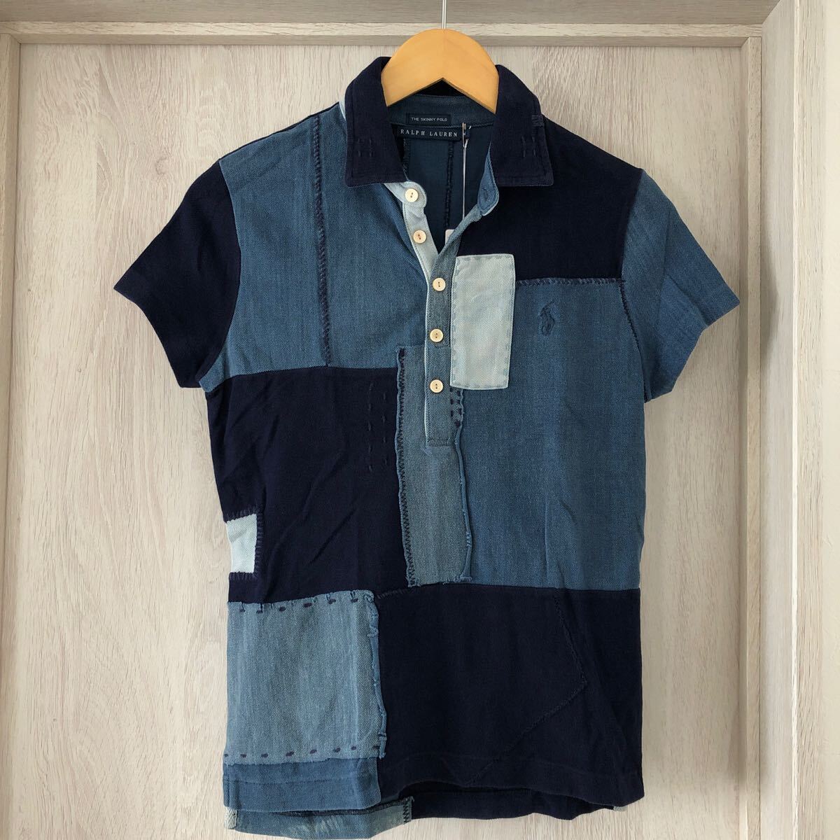 > (k) Polo RalphLauren ラルフローレン 鹿の子 ポロシャツ 刺し子 パッチワーク インディゴ レディース サイズM 青 ブルー 半袖