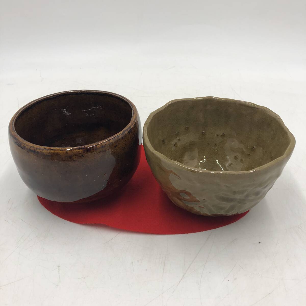 - 【まとめ売り】★抹茶茶碗 2点★陶器 器 草色/茶色 赤布1枚付き 銘あり 茶道具