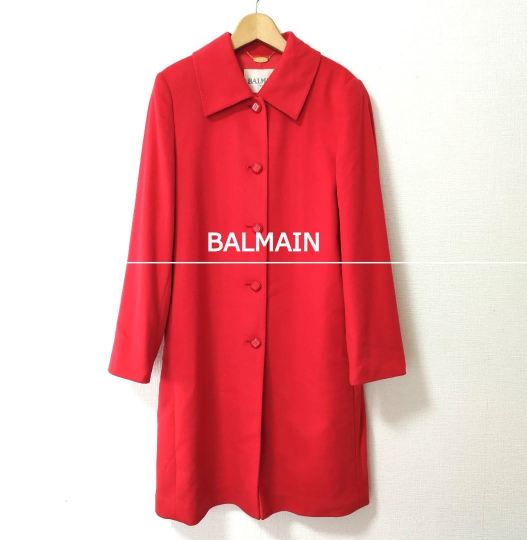 > 美品 BALMAIN バルマン サイズ11 裏地ロゴ ステッチ ロング丈 ステンカラーコート ロングコート 赤 レッド