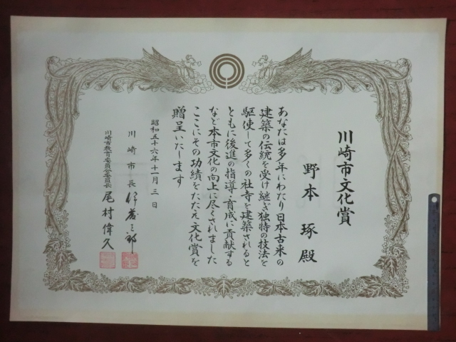 - 賞状図面古文書●昭和56年 川崎市文化賞と事蹟と図面34枚 寺社建築設計士野本琢 240619