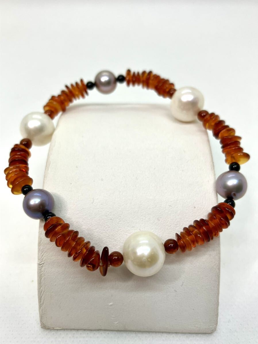 - 【新品】リトアニア産コハクブレスレット*淡水パール*琥珀*アンバー*天然石 *天然石ブレス *パワーストーン *ラウンド*オニキス