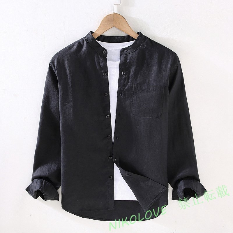 - リネンシャツ メンズ 長袖シャツ 麻100% 立ち襟 無地 ワイシャツ 長袖Tシャツ サマー 春夏 薄手 ブラック M~3XL LD750