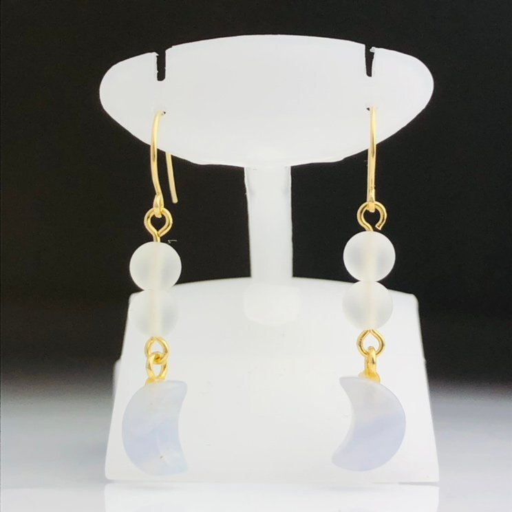 - 【77】 K18 ピアス ムーンモチーフ 月 ムーンストーン? 揺れる 大人キレイ フックピアス 1.3g (597)