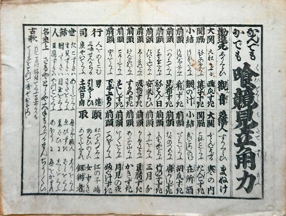 - F19031406〇一枚刷り 和紙木版 浪花みやげ 食競見立角力 観音 ことば遊び しゃれ なぞ 判じ絵 見立番付〇和本古書古文書