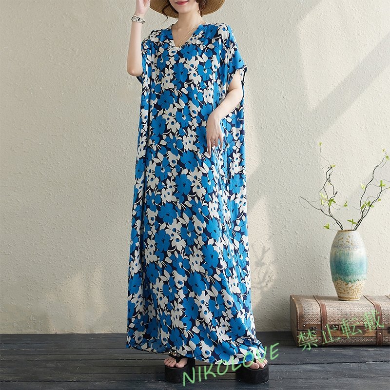 - 新品ゆったりビッグサイズ ファッション Vネック 花柄 半袖 ワンピース ブルー LH461