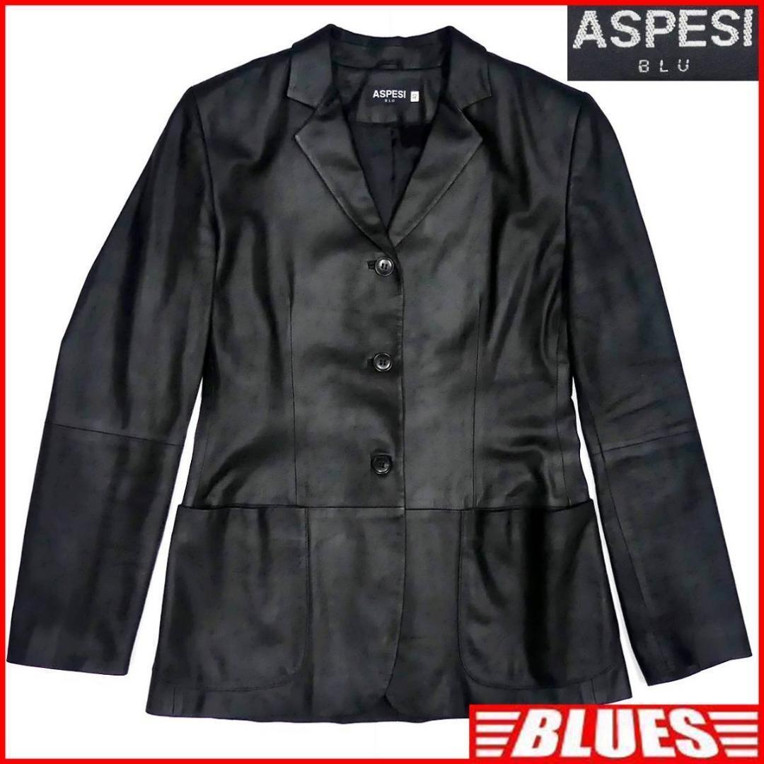 > 即決★ASPESI BLU★レディースM レザーテーラードジャケット アスペジブルー 40 黒 ブラック 本革 スーツ 本皮 ビジネス 革ジャン 背広