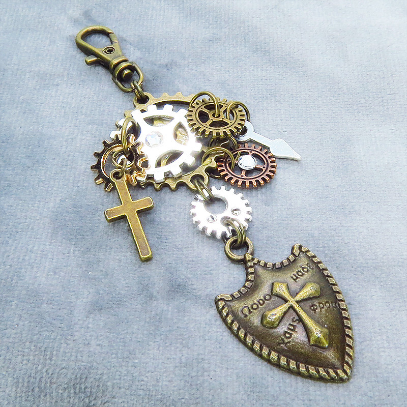 - スチームパンク風 アンティークゴールド 盾と歯車を組合せた重厚感のあるキーホルダー 金具変更可