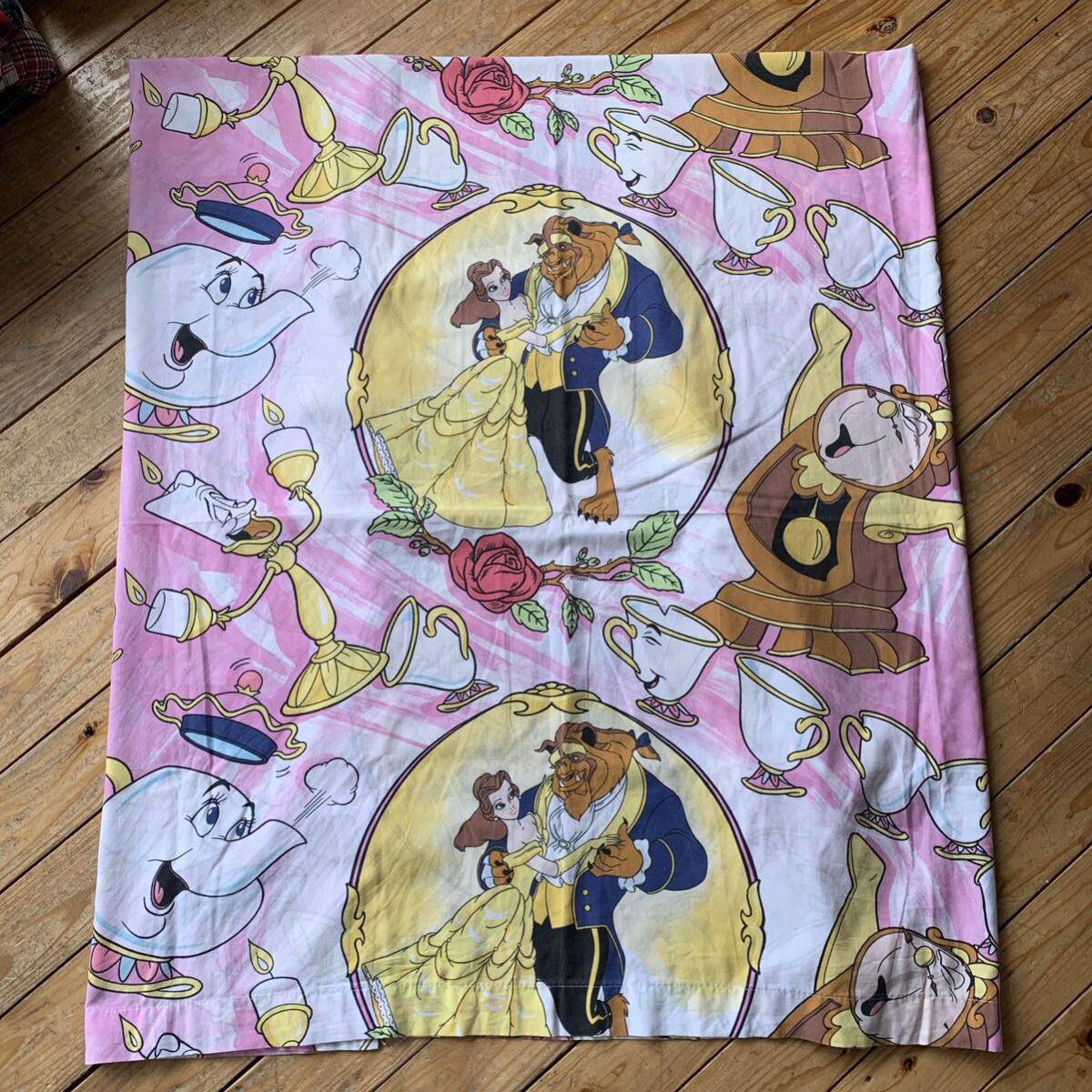 - USAヴィンテージ ベッドシーツ 美女と野獣 リメイク生地 素材 フラットシーツ Disney ディズニー ピンク 映画 総柄 アメリカ仕入 B2242