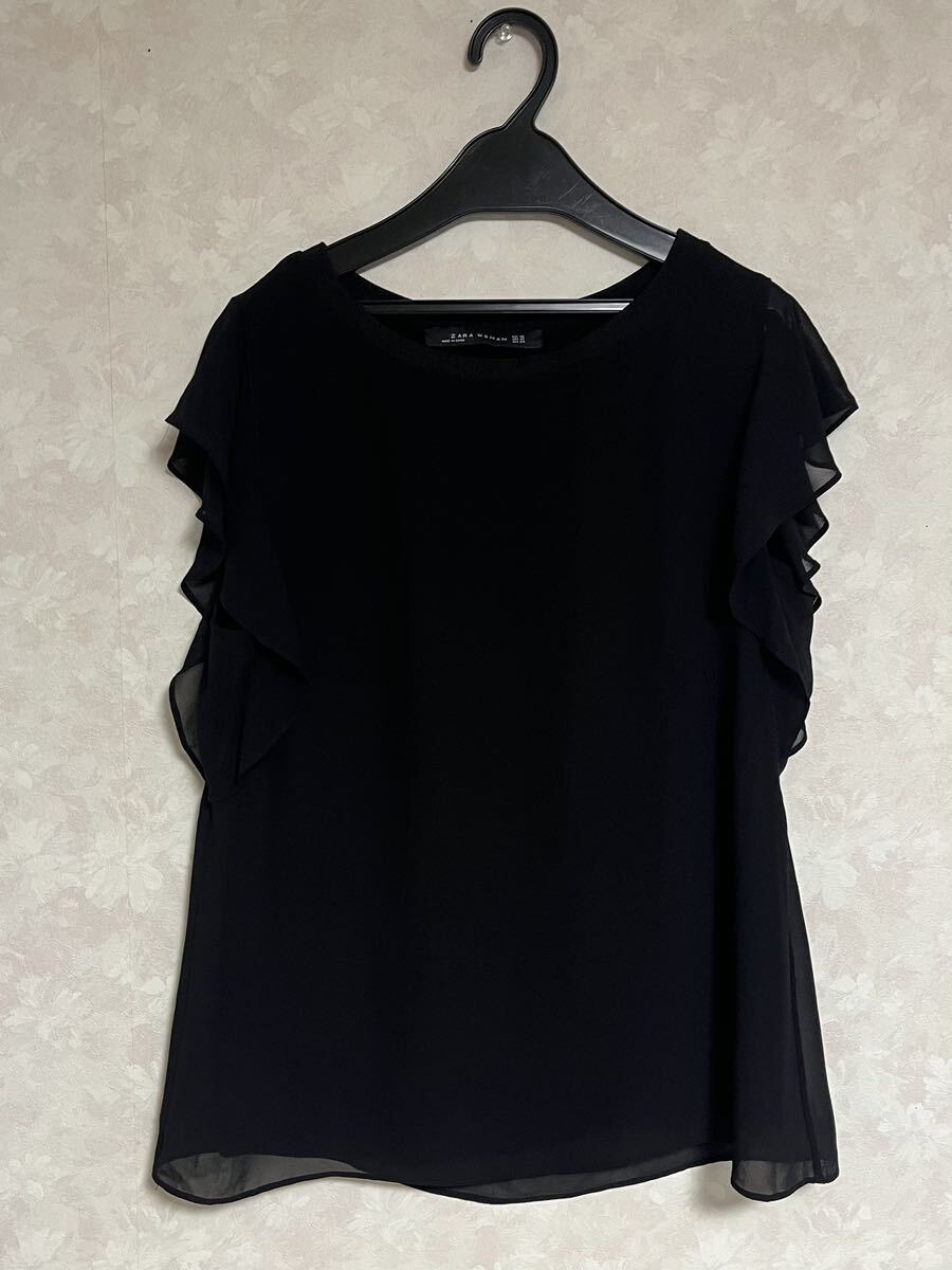 - ZARA WOMAN シフォン フリル 半袖 トップス 黒 ブラック