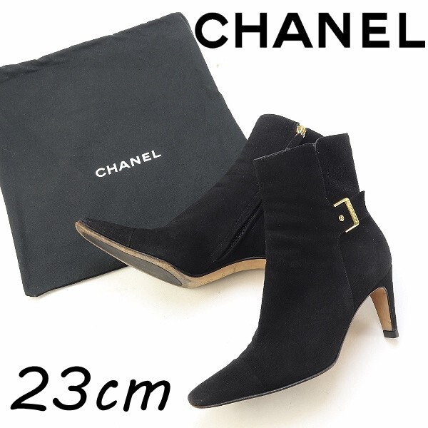 > ◆CHANEL シャネル スエード ココマーク ロゴ ゴールド金具 スクエアトゥ ヒール ショート ブーツ 黒 ブラック 36