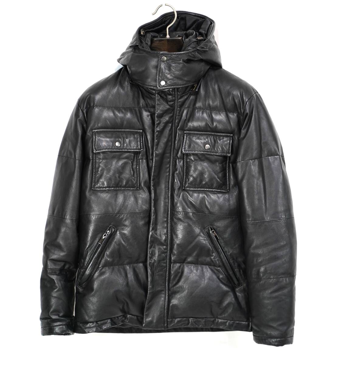 - 即決本物 レザースペシャリスト 羊革 ラム レザーダウン メンズ 黒 ブラック 美品 フード有り 取り外し可能