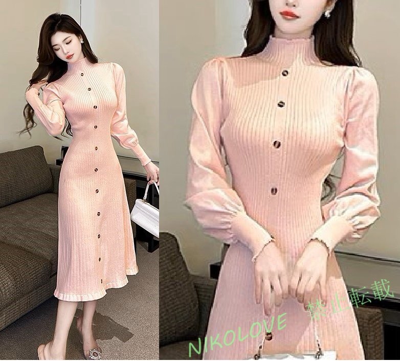 - ☆新品*セクシー**とろみ素材*ボタン*付*ハイネック*リブ*素材*Aライン*フレア*ひざ丈*ロング*ワンピース*ピンク*LF621
