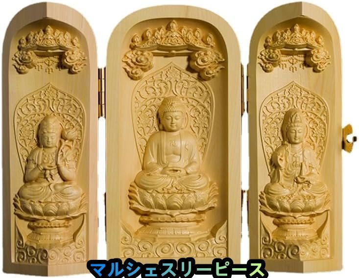 - 仏像 三開仏 【総柘植・彫刻置物】 (高さ10cm、直径5cm、開口幅13cm)守護仏 ツゲ製高級木彫り(筒形)木彫りの仏像 (座西方三聖)