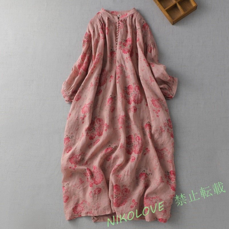 - 新品エレガント秋物 上品 体型カバー ロングワンピース 超綺麗 花柄 ワンピース レディース 大きいサイズピンクLお色選択可 LC182