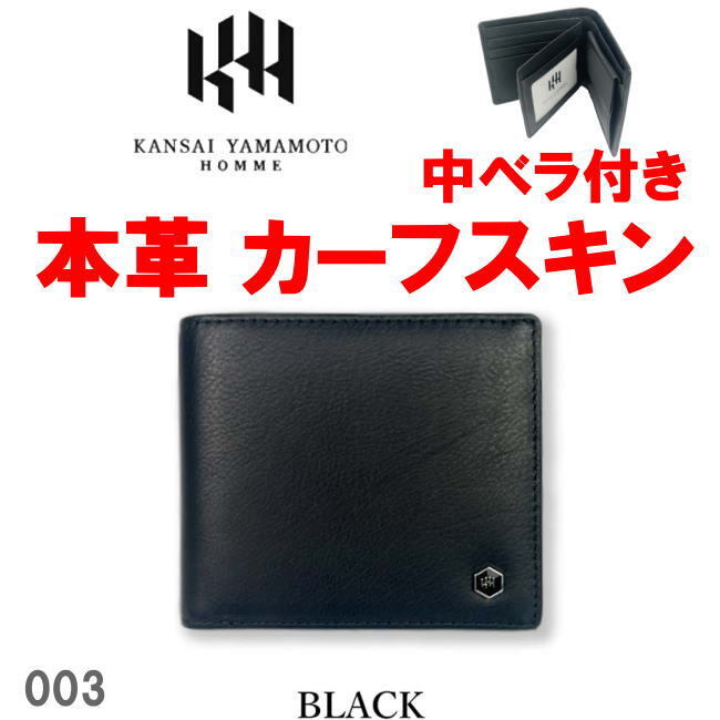 - ブラック 003 ヤマモト カンサイ 中ベラ付き二つ折り財布 本革 カーフスキン