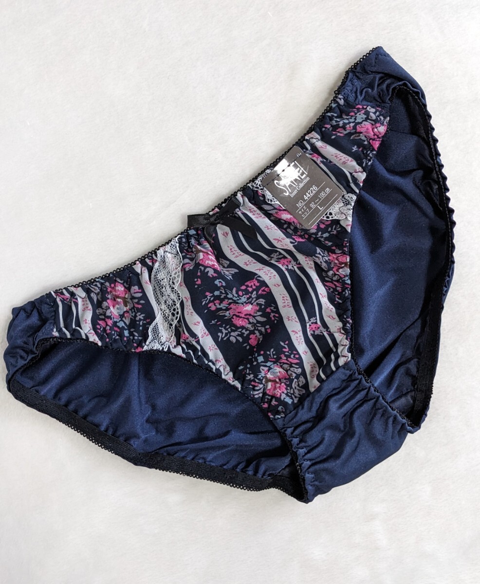 - お泊まりに☆パンティ未使用L☆可愛いお花柄×ランダムストライプ☆ネイビー☆匿名配送可☆タグあり☆