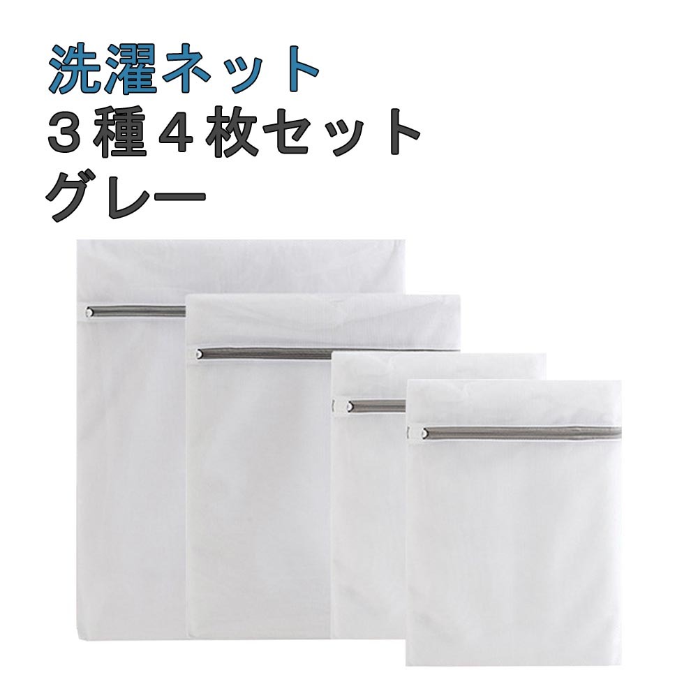 - 洗濯ネット ランドリーネット ファイン サイズ 3種類 4枚セット ファスナーカバー ファスナー グレー 細かめ