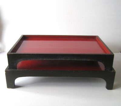 - 朱塗り 外黒 脚付膳 一対 お膳 高足付膳 木製 懐石道具 古民具 大小2個まとめて/23N7.4-7