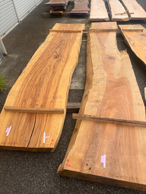 - 4-1188【2枚まとめ売り】長)銘木 とち栃 トチ 厚みのある耳付板と盤 敷台 カウンター材 天板 看板 無垢板 テーブル材千葉県引取可