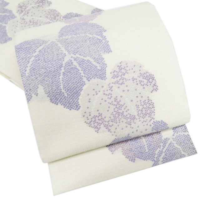 - 袋帯 未使用 正絹 フォーマル 仕立て上がり 六通 葉っぱ模様 銀通し 白色 紫系色 きもの北條 A1067-8