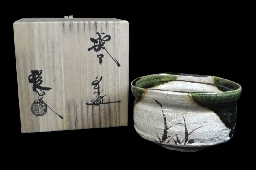 - 織部焼の名工と言われた職人!未使用品!ビンテージ 織部焼 山口錠鉄造 抹茶椀 木箱付 1980〜1990年代 KYI607