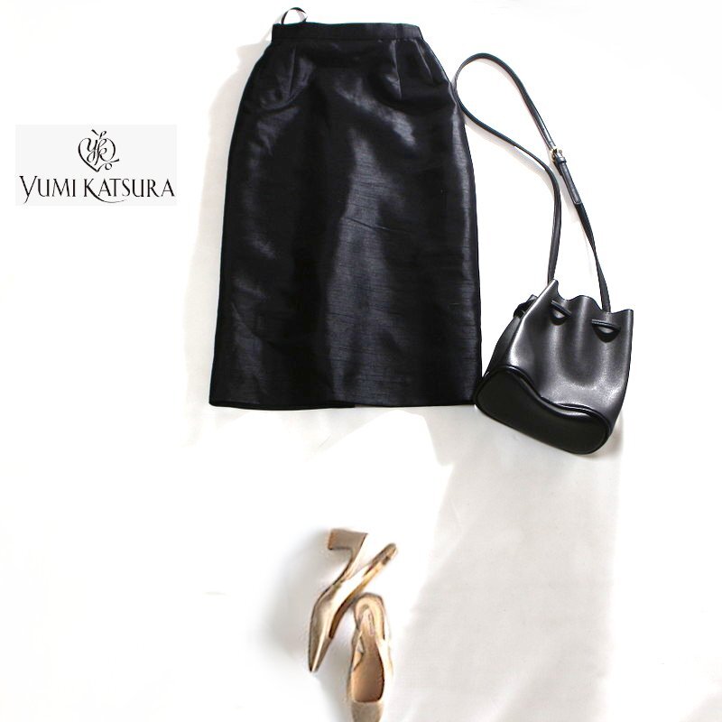 > 美品 Yumi Katsura 桂由美 上品 艶 シルクタッチ 膝下丈 タイトスカート サテンスカート 9号 ブラック 黒 フォーマル 綺麗め