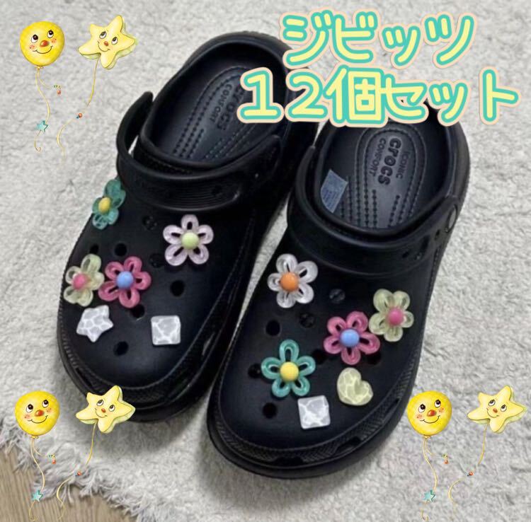 - ジビッツ12個セット フラワー お花 ハート お星様 スター サンダルアクセサリー クロックスアクセサリー キッズ小物 かわいい