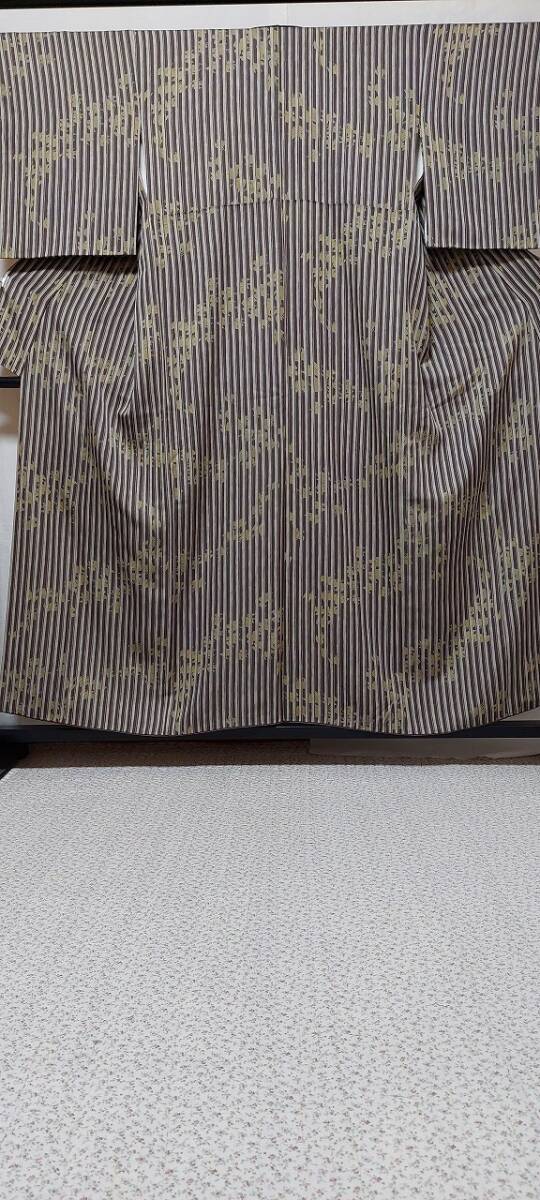 > 【桐輪】小紋☆縦縞と燕☆送料無料☆逸品物*未使用品*美品{正絹*一越地*袷小紋}*身丈159-裄65*煤竹色地*2色縦縞と辛子色の群舞.燕*№4197