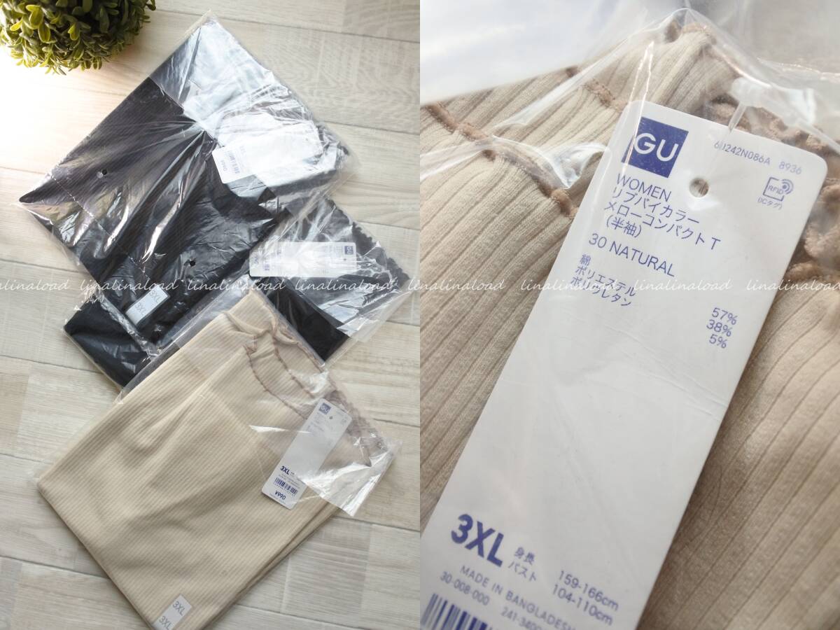 - 未使用 3XL、XXL ×3枚セット GU* リブメロウT① ナチュラル1 ブラック2 綿混 ゆったり ほんのりボトルネック インナーにも