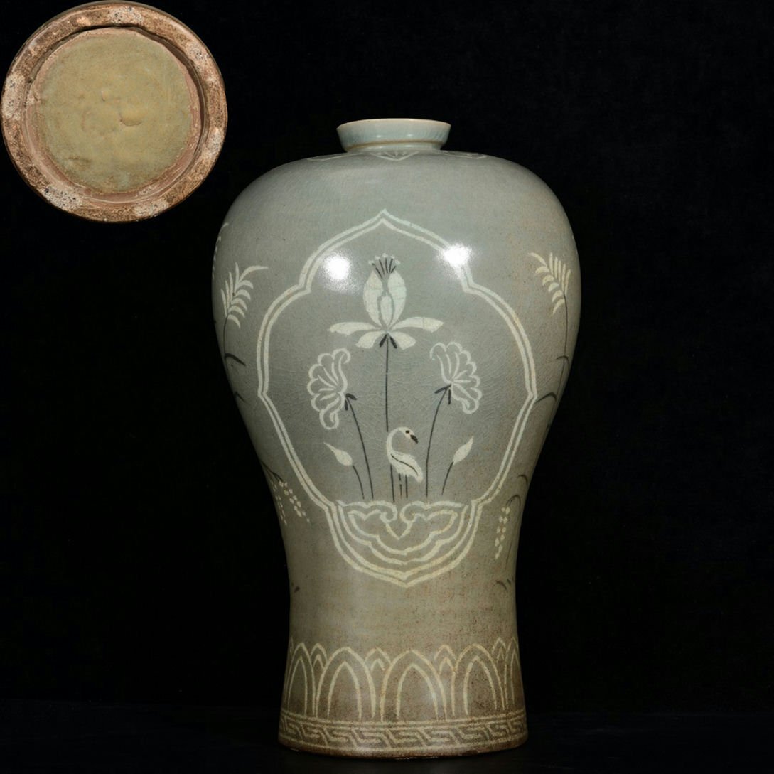 - ▼渡鶴羽▼P875朝鮮古美術 朝鮮古陶 高麗磁 高麗青磁 古高麗 高麗青磁開光蓮塘紋酒瓶梅瓶