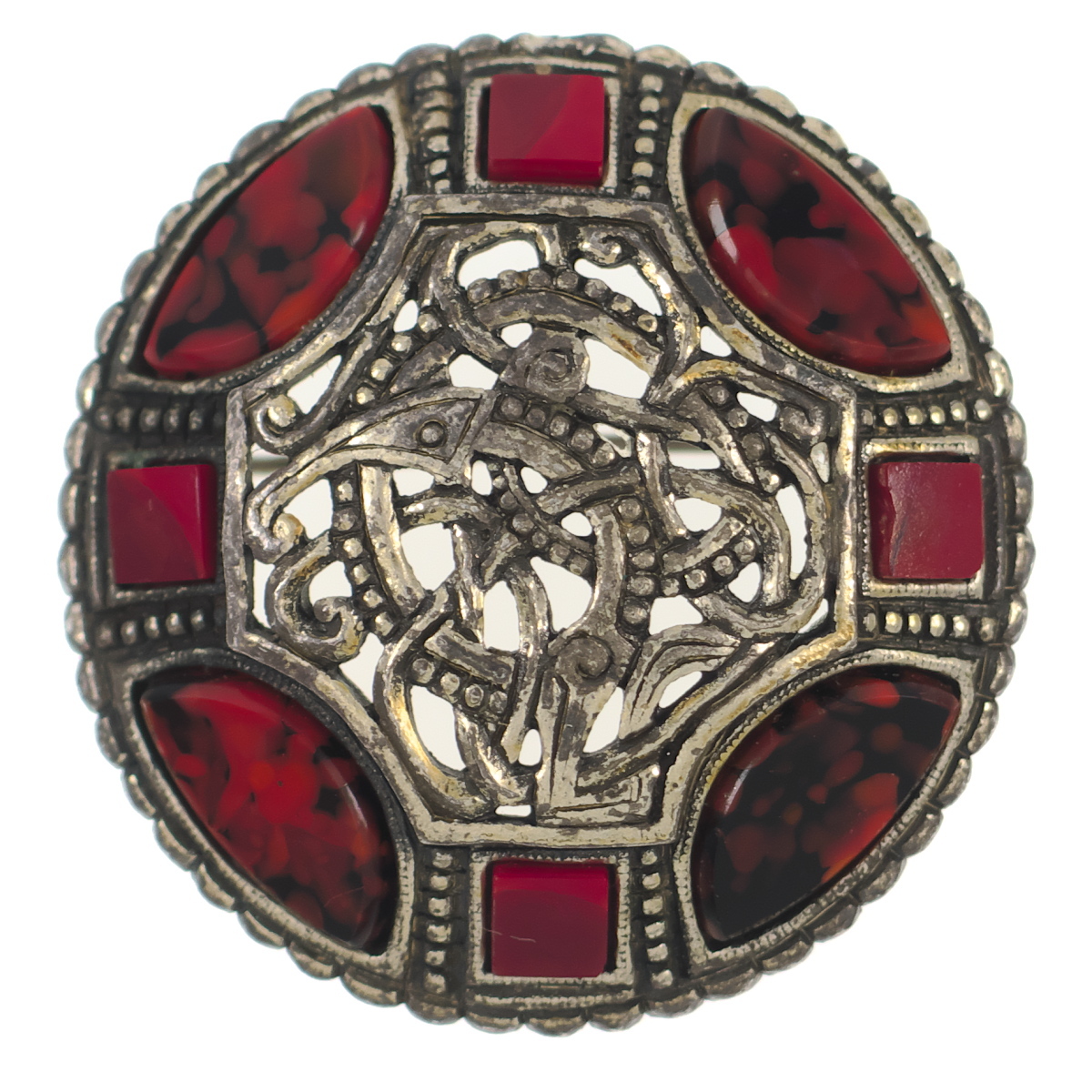 - UK2181◆【MIRACLE】◆ ラウンド ケルト模様 レッド系マーブルストーン 色石 ミラクル イギリス 英国 ◆ ヴィンテージブローチ ◆