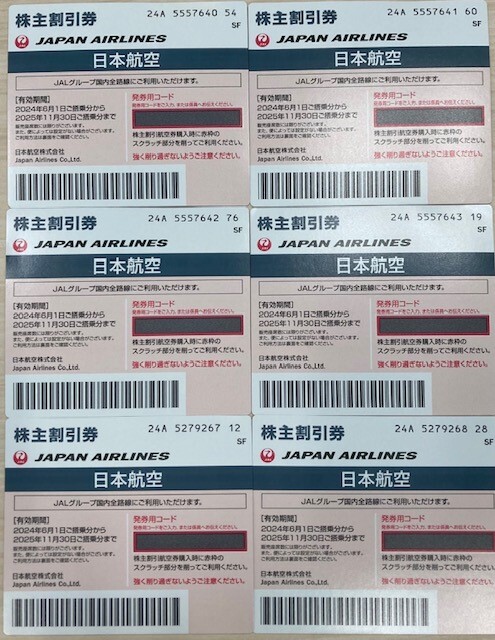 > JAL 日本航空 株主優待券 2025年10月31日まで搭乗分6枚 まで準備有り 即決あり☆ ※1枚価格になります【迅速にコードを通知します】