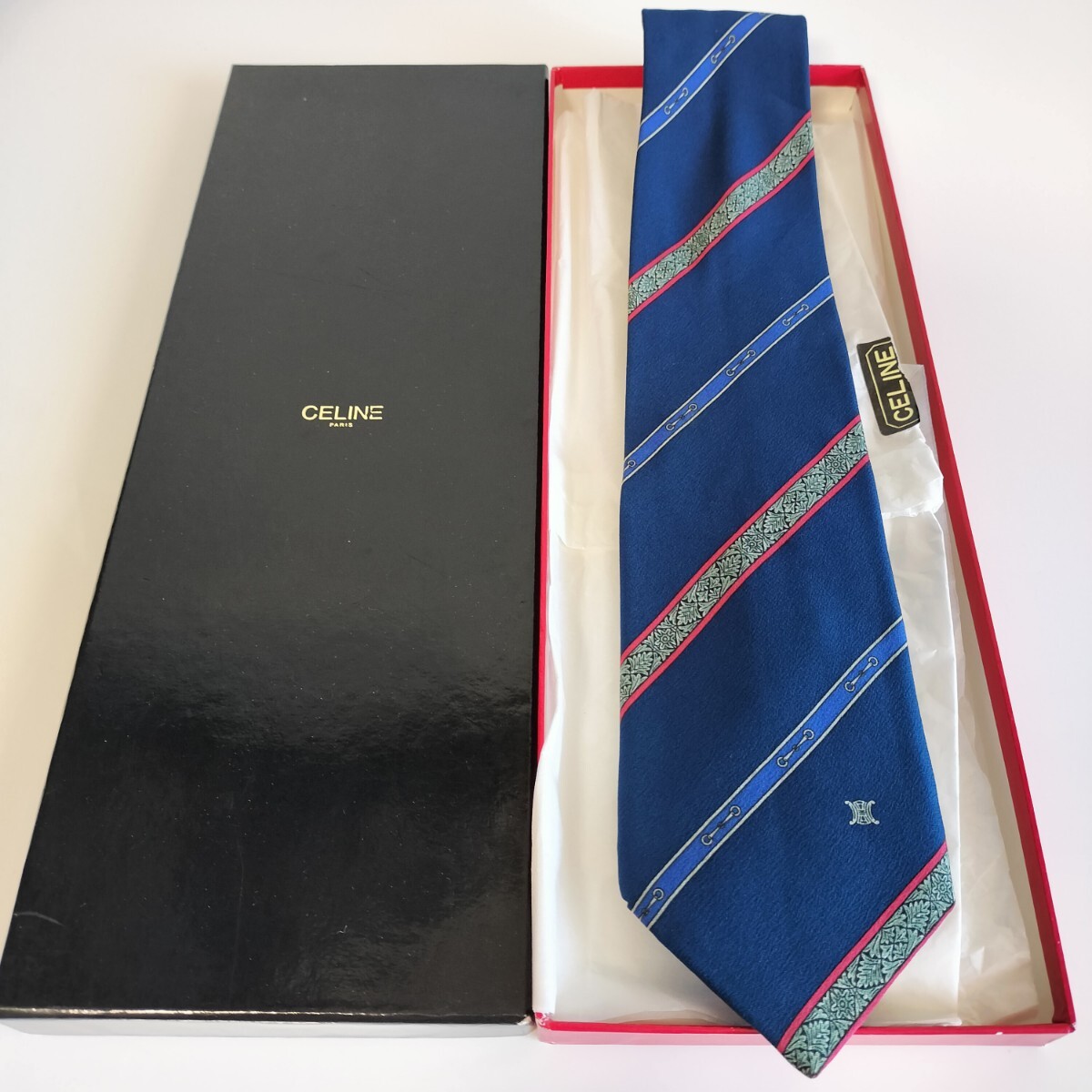 - CELINE(セリーヌ)青赤緑ストライプワンポイントマカダム柄ネクタイ