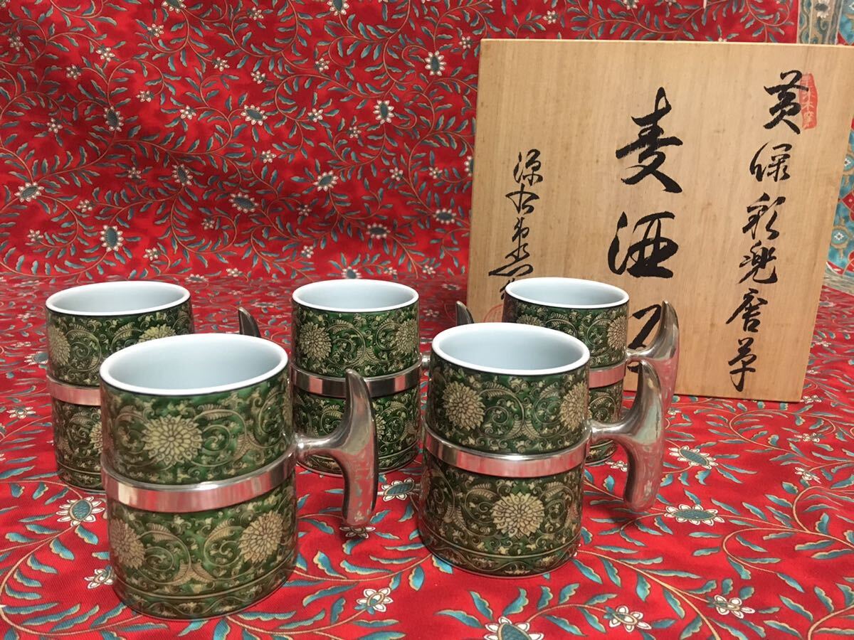 > 【未使用】源右衛門 黄緑彩兜唐草 麦酒杯 5個組 共箱 有田焼 陶器 ビール ジョッキ グラス 和食器 (他 柿右衛門 萬右衛門 等出品してます)
