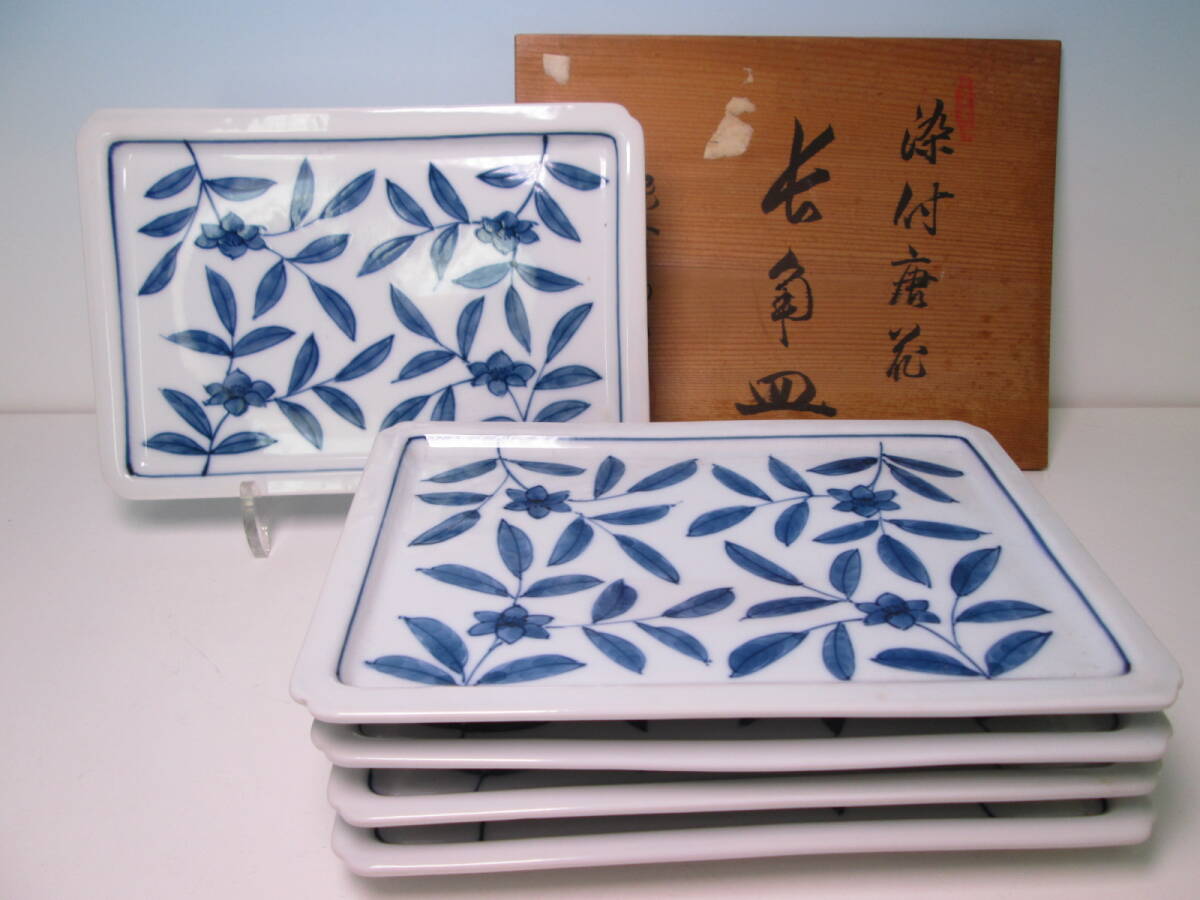 > ☆舘林源右衛門 染付 唐花 長角皿 五客 共箱 お料理屋さんの器/茶懐石/割烹/日本料理