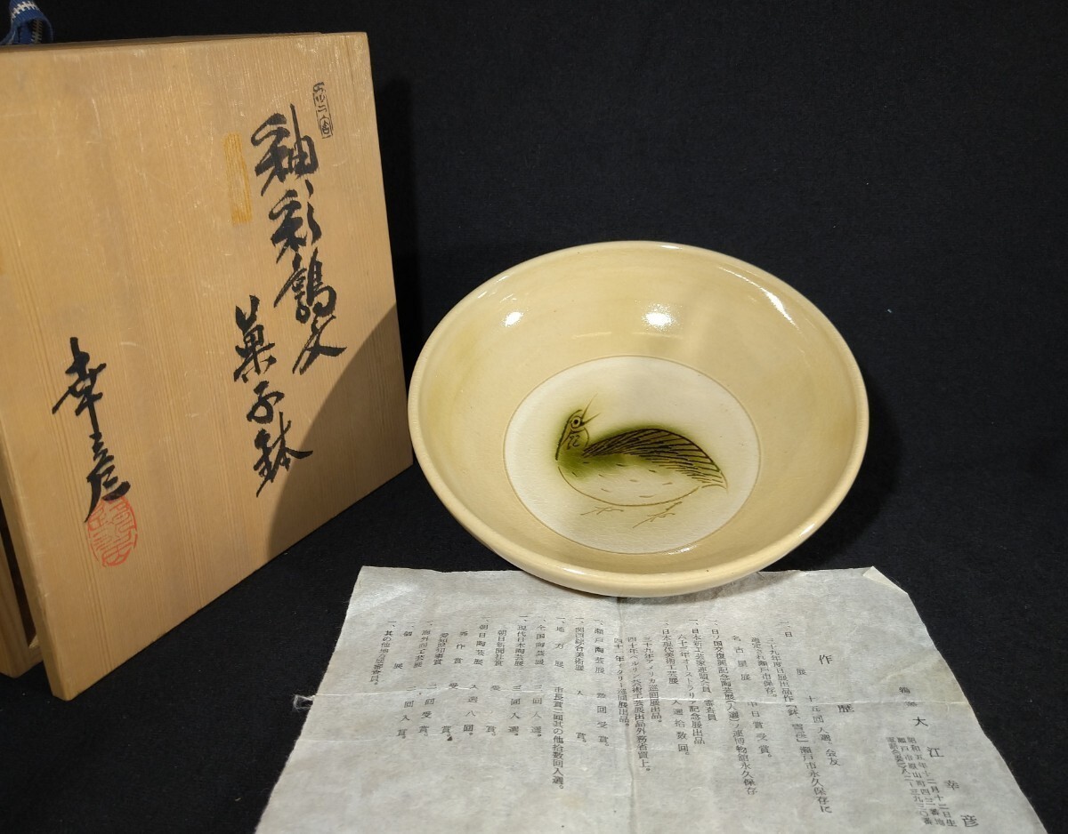 - 大江幸彦 「釉彩鶉文菓子鉢」 釉彩 鶉文 20cm 菓子鉢 共箱 菓子器 茶道具 瀬戸焼 魯山人の盟友大江文象の後継者 b-Ja3253