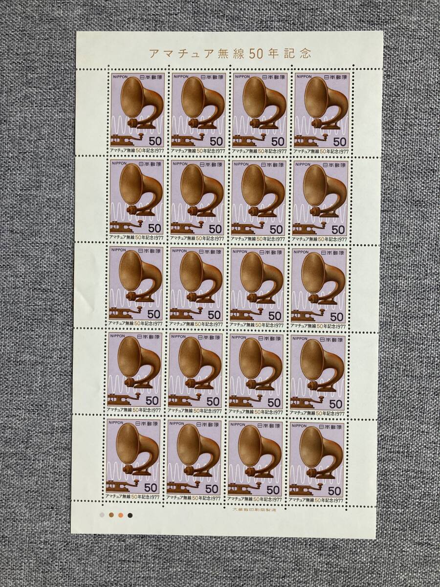 > ★未使用 アマチュア無線 50年記念 昭和初期のホーン型スピーカー 電鍵 電波の波形 1977年 昭和52年 切手シート 50円 20枚 日本郵便